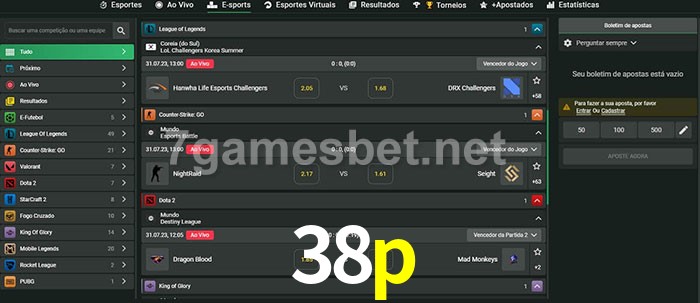 O 38p oferece uma grande seleção de opções de apostas em e-sports com probabilidades competitivas